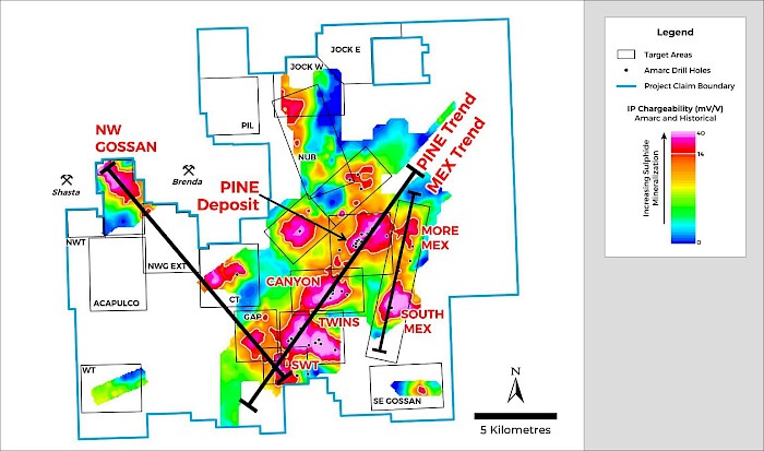 - PINE Trend. Drilling is also planned to advance important scale sulphide mineralized targets along this northeast striking 15 km trend, including at the at the PINE Deposit (6 km2), Canyon Discovery (5 km2), Twins Deposit Target (7 km2) and SWT Target (3 km2) as defined by Induced Polarization (“IP”) chargeability anomalies (Figure 1).