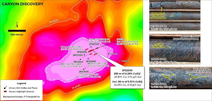 - Canyon Deposit Target. Is where Amarc’s initial drilling discovered significant new porphyry Cu-Au mineralization. Extensions to the mineralization at this largely overburden covered target are currently being drill tested (Figure 3). Discovery drill hole intercepts included, for example, 96 m of 0.51% CuEQ* (0.39% Cu, 0.18 g/t Au and 2.6 g/t Ag), within 296 m of 0.39% CuEQ (0.30% Cu, 0.14 g/t Au and 1.7 g/t Ag) (see Amarc release March 2, 2023).