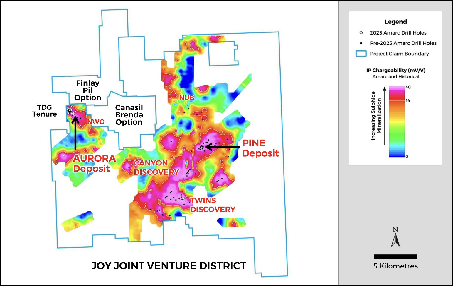 October 22, 2025 - Amarc Resources Ltd. ("Amarc" or the "Company") (TSXV: AHR; OTCQB: AXREF) is pleased to announce the successful completion of the 2025 drill program at the JOY District ("JOY" or "District") in the Toodoggone-Kemess region of north-central British Columbia ("BC"). The 2025 drilling program was primarily designed to expand the AuRORA Deposit, where 2024 drilling discovered high grade near surface copper-gold-silver ("Cu-Au-Ag") mineralization with exceptional vertical and lateral continuity. The area drilled in 2024 measured 500 m by 600 m and remained open to expansion (see Amarc releases January 17 and 20, and February 28, 2025). In addition to the AuRORA Deposit, the 630 km2 JOY District hosts the PINE and Brenda historical deposits, TWINS and Canyon Discoveries and multiple other Cu-Au deposit targets. Amarc believes the AuRORA discovery could be key to the emergence of a potential world-class porphyry Cu-Au district in the Toodoggone.