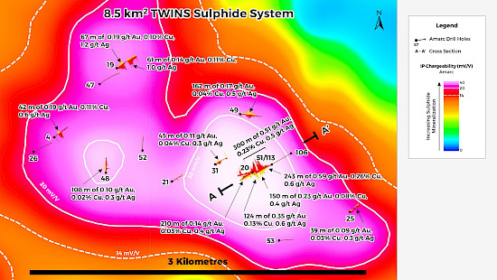 TWINS is located on the 10 km long PINE Porphyry Trend, which also includes the PINE Deposit and the CANYON Discovery (Figure 1). The highly prospective TWINS porphyry target sulphide system is defined by an 8.5 km2 Induced Polarization (“IP”) chargeability geophysical anomaly. The large footprint of this lithocap target, its extensive veneer of glacial overburden cover, the highly anomalous Au intercepts from very widely spaced and relatively shallow reconnaissance drill holes previously released by Amarc, and the 2025 results, highlight the significant exploration potential for discovery of another porphyry Cu-Au deposit (Figure 2, see Amarc releases March 2, 2023 and February 28, 2025).