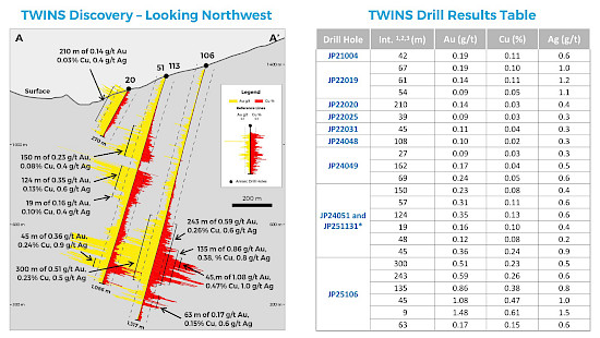 Another early and relatively shallow scout hole (JP22020) tested a magnetic high within the IP chargeability anomaly and intersected a broad 210 m geochemically anomalous interval with 0.14 g/t Au and 0.03% Cu from 12 m1, and is considered to be in proximity to a porphyry Cu-Au deposit (Figures 2 and 3). Based on comparisons with the CANYON Discovery and the PINE Deposit drilling, it was understood that these and other intervals of porphyry Cu-Au mineralization at TWINS could represent the lateral or upper parts of yet undiscovered porphyry Cu-Au centers. Follow up hole JP24051, drilled in 2024, was set back 187 m to the northeast and drilled on the same section but below JP22020: it returned encouraging intercepts of 124 m at 0.35 g/t Au and 0.13% Cu, including 57 m at 0.31 g/t Au and 0.11% Cu from 441 m with alteration and mineralization strengthening with depth.