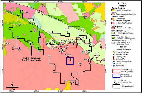 Amarc's IKE Cu and Au district is located in a fertile region of south-central British Columbia ("BC") that hosts other large Cu±Au±Mo deposits with similar geological settings. Like many major porphyry districts, the IKE district formed in a very active environment characterised by long-lived, multi-phase magmatic--hydrothermal-structural activity, resulting in multiple centers of mineralization. The Au-bearing Empress deposit and other deposit targets within the Greater Empress area were formed at about 85-80 Ma and, as such are distinct from the hydrothermal activity that formed the approximately 46 Ma IKE porphyry Cu-Mo-Ag deposit that is hosted within the Coastal Plutonic Complex ("CPC") (Figure 1).