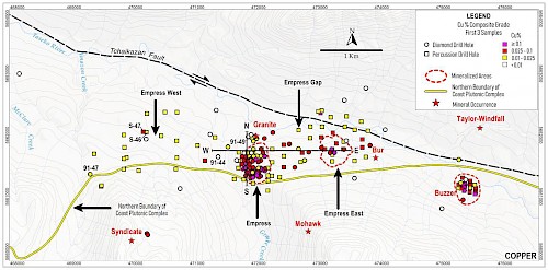 The Greater Empress area straddles the CPC contact with volcanic rocks to the north, over a strike length of 15 km (Figure 1). Strong and widespread alteration with abundant sulphides is associated with a variety of deposit types including porphyry Cu±Au±Mo±Ag and high temperature Cu-Au-Ag replacement, as well as Au-Ag high sulphidation and possibly low sulphidation epithermal systems. The range of paleodepth indicated by these deposit types increases the possibility for the preservation of deposits in the IKE district, so increasing the discovery potential.