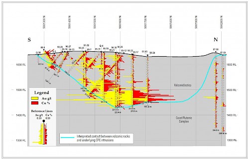 Figure 3: South to north cross section S-N (see Figure 2 for section location) through the Empress deposit drilling looking West, showing drill hole sample bar graphs for Cu-Au grades. The location of the CPC-volcanic contact is shown by the blue line.