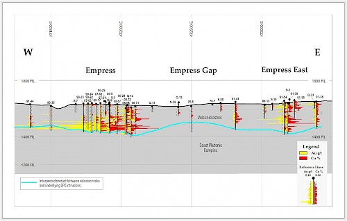 Figure 4: West to east Long Section W-E (see Figure 2 for section location) through the Empress, Empress Gap and Empress East drilling, looking north, showing Cu-Au grades. Note the CPC-volcanic contact as shown by the blue line.