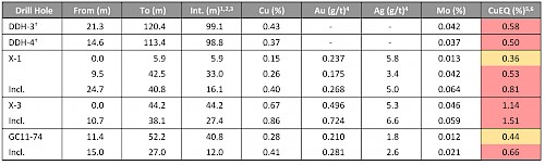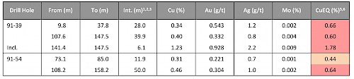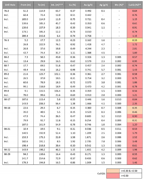 (-) means not assayed for. - Copper equivalent (CuEQ) calculations use metal prices of: Cu US$3.00/lb, Mo US$12.00/lb, Ag US$18.00/oz and Au US$1,400.00/oz and conceptual recoveries of: Cu 90%, Au 72%, 67% Ag and 82% Mo. Conversion of metals to an equivalent Cu grade based on these metal prices is relative to the Cu price per unit mass factored by predicted recoveries for those metals normalized to the copper recovery. The metal equivalencies for each metal are added to the Cu grade. The general formula for this is: CuEQ % = Cu% + (Au g/t * (Au recovery / Cu recovery) * (Au $ per oz/ 31.1034768) / (Cu $ per lb* 22.04623)) + (Ag g/t * (Ag recovery / Cu recovery) * (Ag $ per oz/ 31.1034768) / (Cu $ per lb* 22.04623)) + (Mo % * (Mo recovery / Cu recovery) * (Mo $ per lb / Cu $ per lb)).