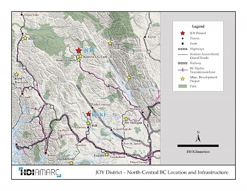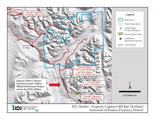 Amarc's 100%-owned 482 km2 JOY Project covers the northern extension of the prolific Kemess porphyry copper-gold district (the "Kemess District") in the Toodoggone region of north-central BC (see attached figures1). The Kemess District is well-known to Amarc's technical team through their association with Hunter Dickinson Inc. ("HDI"); its members are credited as being the first to recognize the District's true porphyry potential -- acquiring both the early-stage Kemess North and Kemess South prospects and advancing them to significant porphyry copper-gold deposits, before selling the projects to a predecessor of Northgate Minerals ("Northgate"). Northgate went on to develop the Kemess South mine (BC's third largest gold producer), producing 3 million ounces of gold, and 750 million pounds of copper over a 13-year period to 20112. The southern area of the Kemess District is now held by Centerra Gold Inc. ("Centerra"), and includes the government-approved Kemess Underground Project (the deeper higher grade extension of the Kemess North deposit), the advanced stage Kemess East deposit as well as the mined-out Kemess South deposit. The resource road that services Centerra's deposits and the historical Lawyers and Shasta gold-silver mines, also provides access to Amarc's JOY Project.