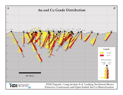 The PINE deposit is a northeast-trending, 2.5 km-long porphyry copper-gold mineralized system located within an underexplored 6 km2 area of strong hydrothermal alteration, as defined by IP chargeability, alteration mapping and limited historical drilling. At the PINE deposit, shallow historical drilling (most holes record less than 175 m vertical penetration) indicates that mineralization is open both laterally and to depth, with many of the holes ending in mineralization and some showing a downhole increase in copper and gold grades (see attached figure). Examples of the historical results are: hole P97-08 that intersected 141 m of 0.17% Cu, 0.49 g/t Au, 2.0 g/t Ag and 0.001% Mo from 128 m, hole 92-40 that intersected 85 m of 0.14% Cu, 0.73 g/t Au, 0.6 g/t Ag and 0.002% Mo from 55 m, and hole 93-44 that intersected 82 m of 0.12% Cu, 0.52 g/t Au, 1.1 g/t Ag and 0.003% Mo from 37 m. In addition to the delineated drill-ready targets at PINE, untested areas of high IP chargeability and/or soil geochemistry lie between the widely-spaced historical holes and extend outward laterally, with the majority of the surrounding 6 km2 area of strong hydrothermal alteration remaining to be fully explored.