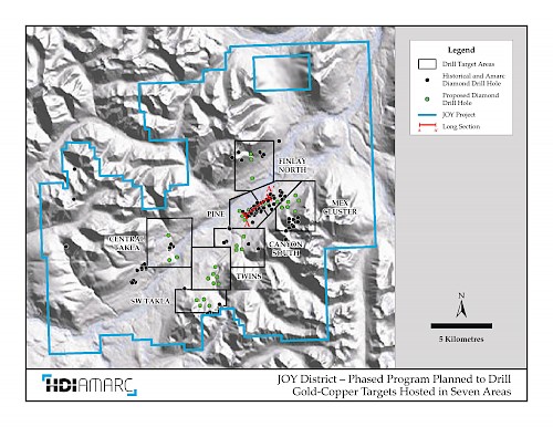 The PINE deposit and MEX deposit target on the JOY Project have seen several phases of historical drilling. Work by Amarc has identified significant expansion potential at both that requires drill testing. In addition, Amarc has defined seven large (approximately 1 to 8 km2), high potential porphyry copper-gold exploration target areas, each of which hosts multiple targets that are either drill-ready, or can rapidly be brought up to a drill ready status by the completion of focused surface surveys (see attached figure). A highly effective targeting strategy was achieved by combining and interpreting information from the Company's exploration surveys and extensive historical datasets. These datasets include results from soil geochemical sample grids, airborne magnetics and ground Induced Polarization ("IP") geophysical surveys, geological and alteration mapping and historical drilling. The large historical soils geochemical database (6,390 samples) was particularly useful.