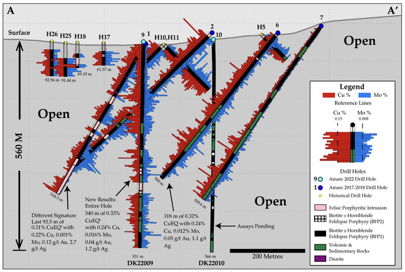 Hole DK22009 is the first of two holes completed in December 2022 in the central area of the DUKE Deposit to test the geometry and depth potential of the mineralization. The hole was drilled in the vicinity of previous Amarc drill holes (including DK17001 and DK17002, listed as “1” and “2” on Figures 1 and 2; see also December 19, 2017 and June 12, 2018 news releases). The hole intercepted significant Cu-Mo-Au-Ag mineralization from the bedrock surface to the bottom of hole, including several sub-intervals of higher grade. The results are of good tenor and continuity and indicate that the DUKE Deposit extends to significantly greater depth than previously known (Figure 1).