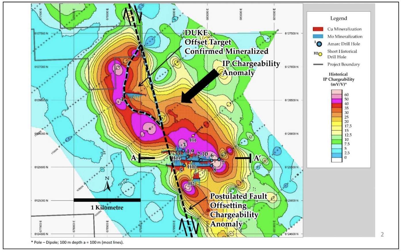 Central to Amarc's extensive mineral tenure is the DUKE Deposit discovery, located 30 km north of the former Bell Mine. Although explored historically, the extensive porphyry Cu system at the DUKE discovery has not been delineated or drilled off. Many of the 21 historical shallow and closely-spaced core holes intersected and ended in significant Cu-Mo-Au-Ag mineralization. These holes were restricted to a small portion of a robust, 3 km north-south by 1 km east-west IP chargeability anomaly indicating a large sulphide mineralized system. Amarc completed initial drilling at the DUKE Deposit in 2017 and 2018. Seven of the eight core holes drilled over an area measuring approximately 400 m north-south by 600 m east-west (see December 19, 2017 and June 12, 2018 news releases) successfully intersected porphyry copper-style mineralization to a vertical depth of 360 m. This mineralization remains wide open to expansion. The eighth hole was drilled off a road one kilometre to the north and within the 3 km2 sulphide mineral system; it intersected similar copper-molybdenum-silver-gold porphyry mineralization.