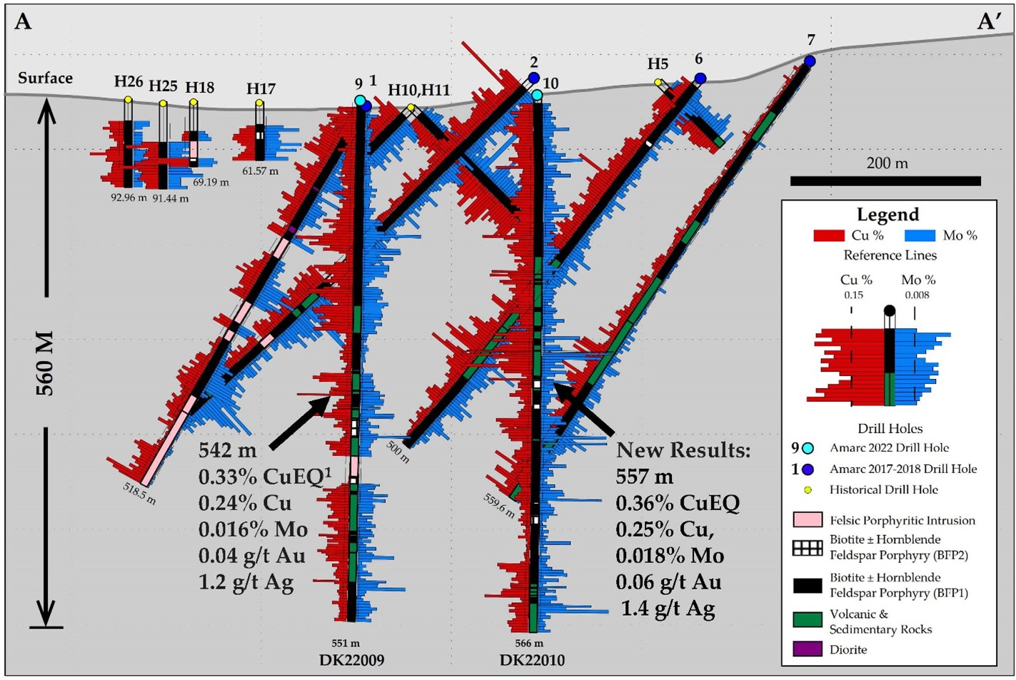Figures 1 and 2 show the location of hole DK22010 in relation to previous Amarc drill holes, including DK17001 and DK17002 to the west, and DK18006 and DK18007 to the east, listed as “1”, “2”, “6” and “7”, respectively, on the figures. The latter holes are further described in Amarc’s December 19, 2017 and June 12, 2018 news releases.