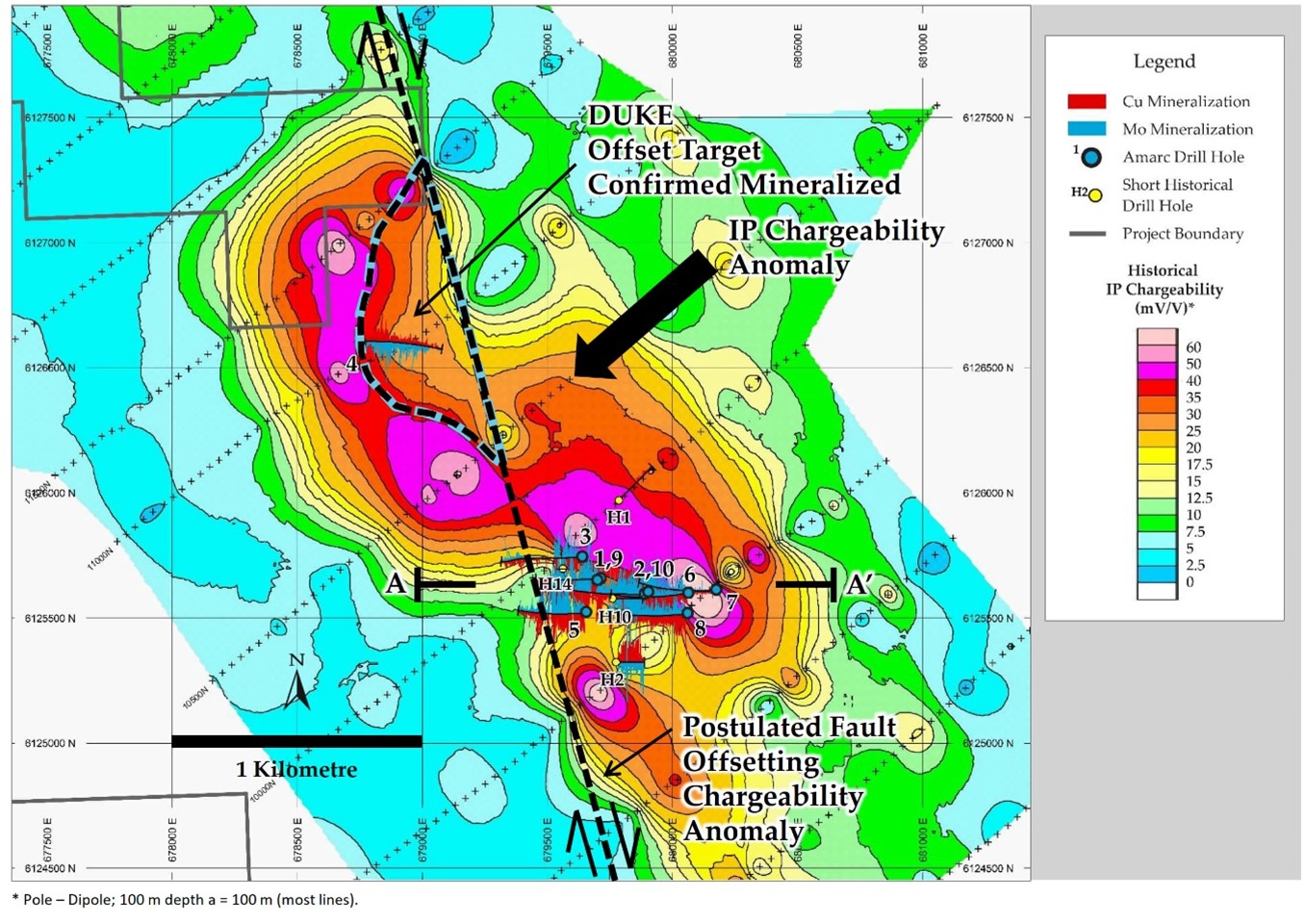 Central to Amarc's extensive mineral tenure is the DUKE Deposit discovery, located 30 km north of the former Bell Mine. Although explored historically, the extensive porphyry Cu system at the DUKE discovery has not been delineated or drilled off. Many of the 21 historical shallow and closely-spaced core holes intersected and ended in significant Cu-Mo-Au-Ag mineralization. These holes were restricted to a small portion of a robust, 4.7 km2 IP chargeability anomaly indicating a large sulphide mineralized system. Amarc completed initial drilling at the DUKE Deposit in 2017 and 2018. Seven of the eight core holes drilled over an area measuring approximately 400 m north-south by 600 m east-west (see December 19, 2017 and June 12, 2018 news releases) successfully intersected porphyry copper-style mineralization to a vertical depth of 360 m. This mineralization remains wide open to expansion. The eighth hole was drilled off a road one kilometre to the north and within the sulphide mineral system; it intersected similar copper-molybdenum-silver-gold porphyry mineralization.